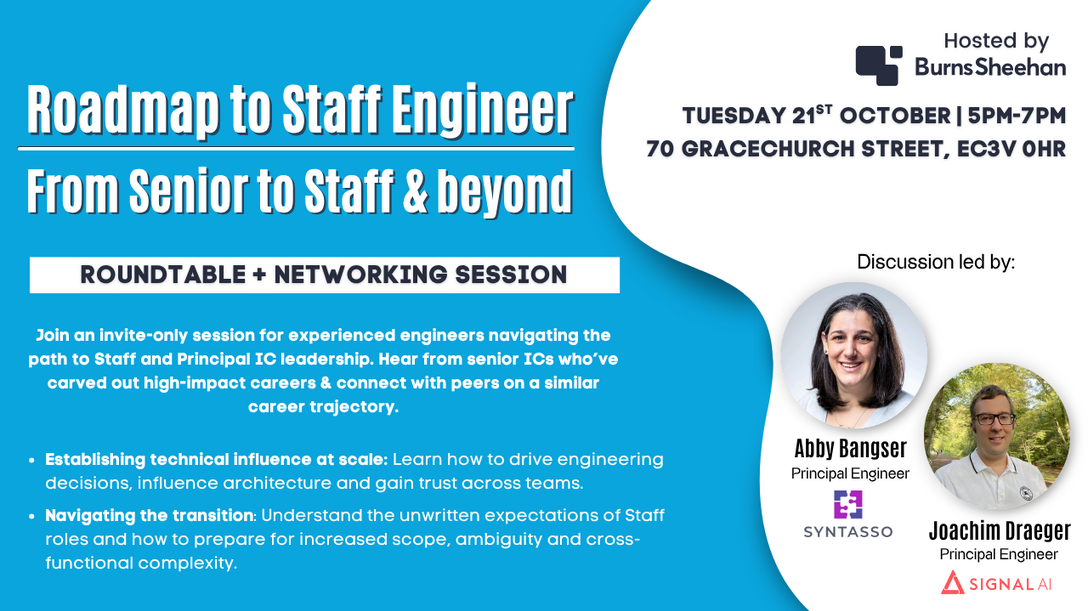 At our latest roundtable, we brought together Senior Engineers who are aiming for Staff and Principal roles — a career step that’s less about writing better code and more about influence, breadth, and enabling others to have greater impact. The session focused on the real challenges, lessons, and mindset shifts involved in moving into IC leadership.